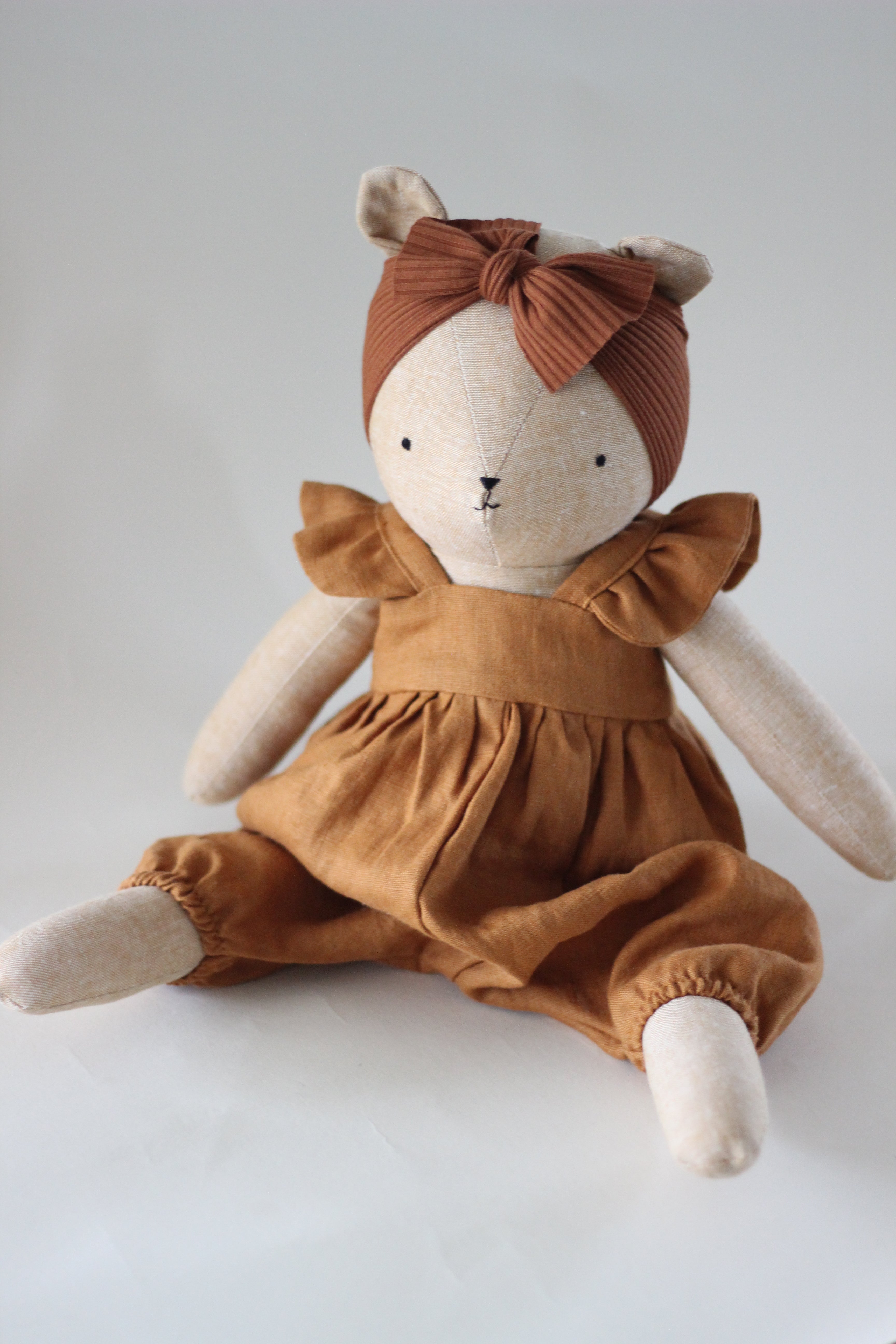 This bear comes with a cotton gauze romper and stretchy tied head bow. They fit all our 17” doll clothing.
