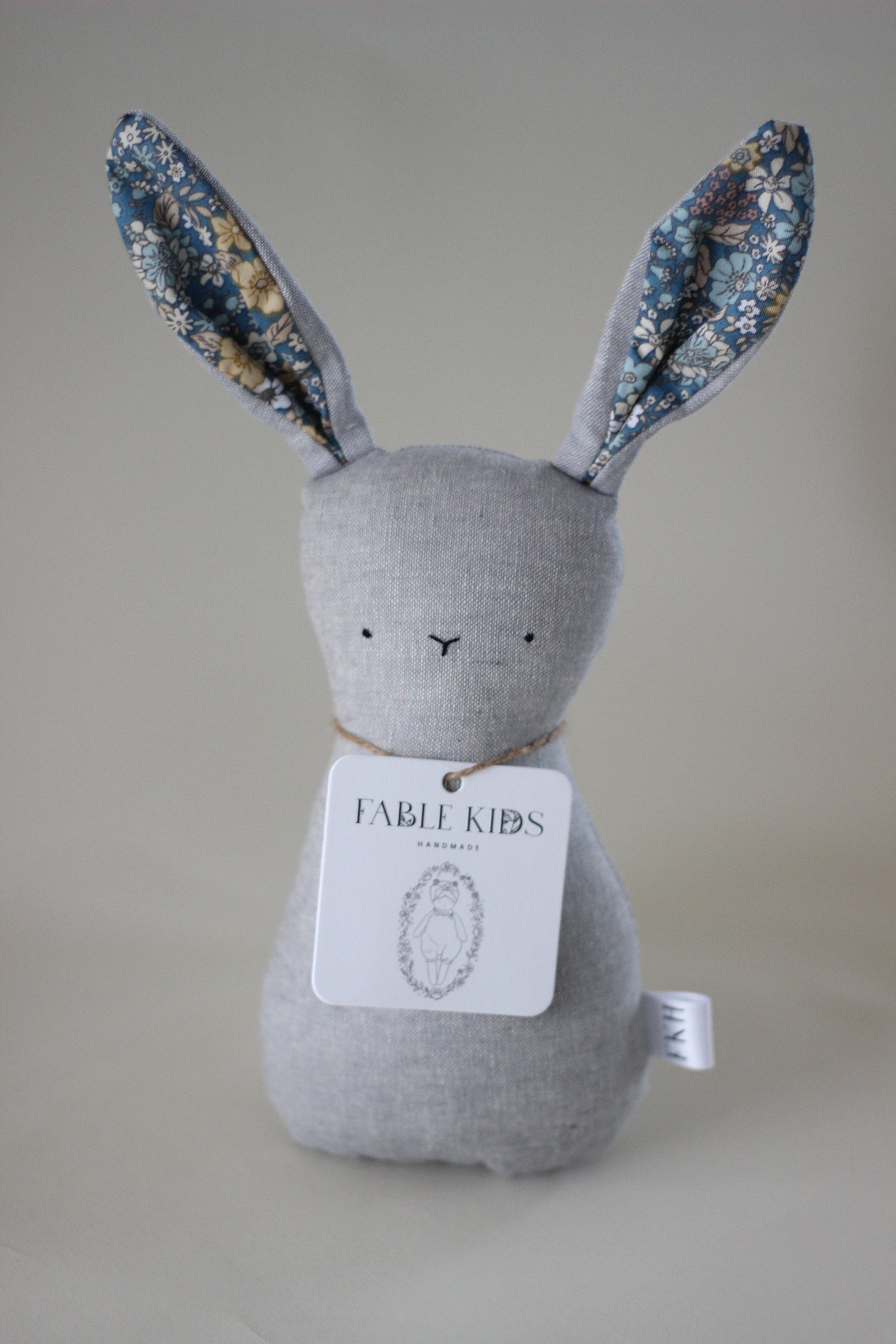 These bunny measure approximately 7” tall and our firmly hand-stuffed to create a long -lasting heirloom. We use 100% new hypoallergenic poly fibre made in Canada to create the perfect light weight, firm, yet with a hint of squish, doll for this age category. Then we hand-stitch each baby closed.